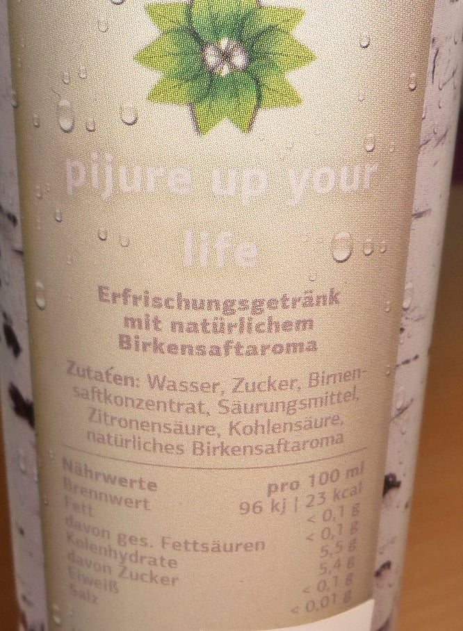 Mit nur 23 kcal pro 100 ml ist Pijure ein richtig leichtes Erfrischungsgetränk der ganz besonderen Art, denn es ist nicht zu süß (5,4 g auf 100 ml = 1,5 Zuckerwürfel) und nicht zu sauer, prickelt angenehm im Mund und bringt geschmacklich durch das natürliche Birkensaftaroma etwas völlig Neues in Euer Glas.