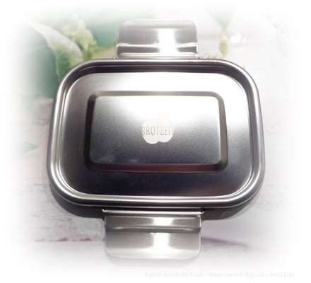 Aussen auf dem Deckel befindet sich auf der linken Seite der Lunchbox/Brotdose ein Aufdruck - ein Apfel mit dem Logo BROTZEIT.