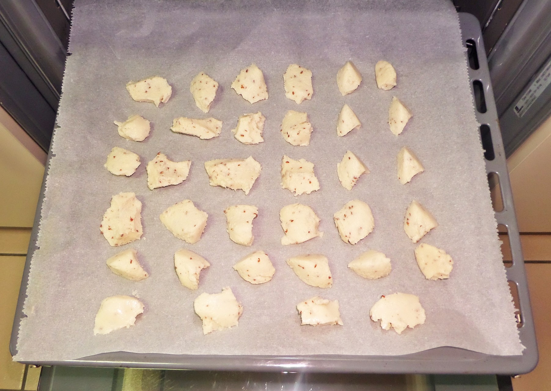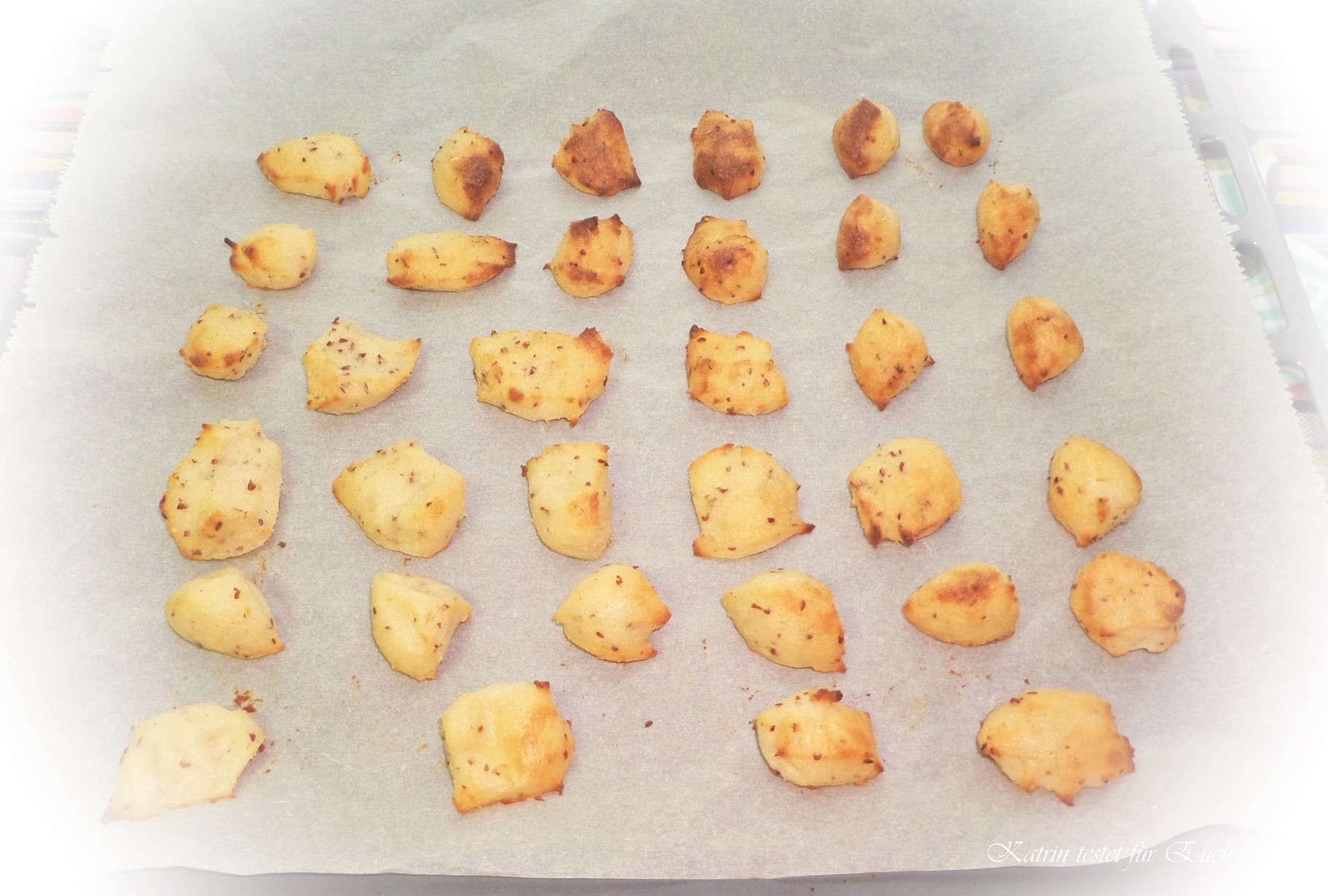 Erst hatte ich überlegt, ob ich dem Grießbrei jetzt Ei untermische, aber dann dachte ich *och nö lass mal so und stach den Grießbrei einfach mit einem Teelöffel in kleine Stücke aus. Ihr müsst nicht mal auf Form und Größe achten, denn am Ende werdet Ihr sehen, ist es egal ;) ...