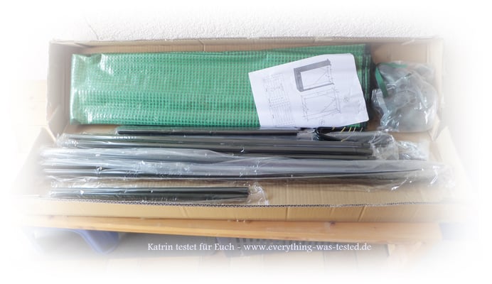 Ok, die Beschreibung (Bild 1) war etwas karg, aber wenn man zu zweit ist, dann ist das Gewächshaus schnell aufgebaut (ich habe es auch allein geschafft). Es sind ja nur wenige Teile die man zusammenschrauben, bzw. stecken muss. Anschließend kommt die Plane über das Gestell und schon ist es fertig zum Aufstellen 😉 ... Ein passender Platz war schnell am alten Gewächshaus (wird leider nur noch als Abstellraum verwendet, da es defekt ist) gefunden.