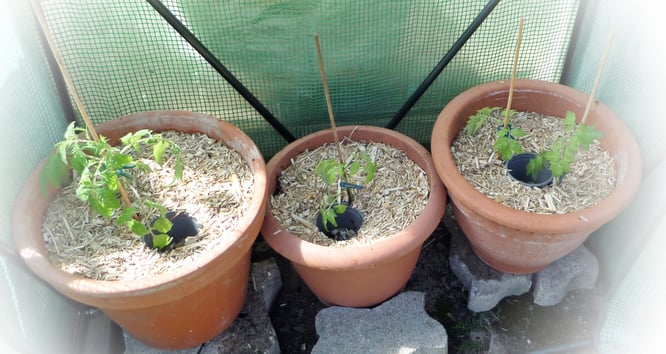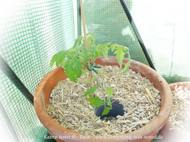 Da die Tomaten natürlich im Topf auch geschützt sein müssen, habe ich die Erde mit Mulch abgedeckt und hoffe, dass dies noch etwas mehr Wärmeschutz gibt und ich natürlich auch weniger gießen muss. Die vorherigen Nächte waren noch einmal kühl und die Temperatur ging bis ca. 2 Grad (+/-) runter und ich dacht 😳 ohje, hoffentlich überleben sie das ...