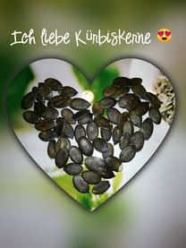 Kürbiskerne stammen, wie der Name es schon verrät und jeder weiß, aus dem Kürbis. Sie sind nicht einfach nur platt und grün, sondern sind kleine Kraftprotze, weil sie reich an Protein (Eiweiß) und Ballaststoffen sind, sowie Antioxidantien. Zusätzlich enthalten sie Magnesium, Eisen, Zink und Selen. 👍Vitamine wie A, B1, B2, B5, E und Niacin, Folsäure und Karotinoide - Omega-3 und Omega-6 Fettsäuren, also alles was unser Körper gut gebrauchen kann - Gesundheit trifft auf Genuss !