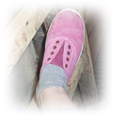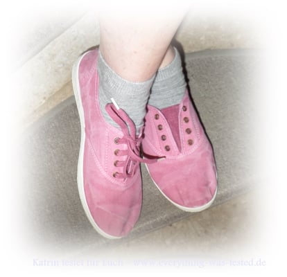 Da zu hundert Prozent umweltfreundlichen Farben verwendet wurden, kann es schon mal zu einer Verfärbung der Strümpfe kommen, daher besser barfuß in die Schuhe oder einfach keine weißen Söckchen anziehen. 😁