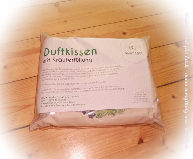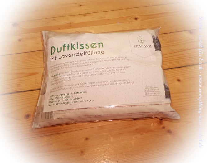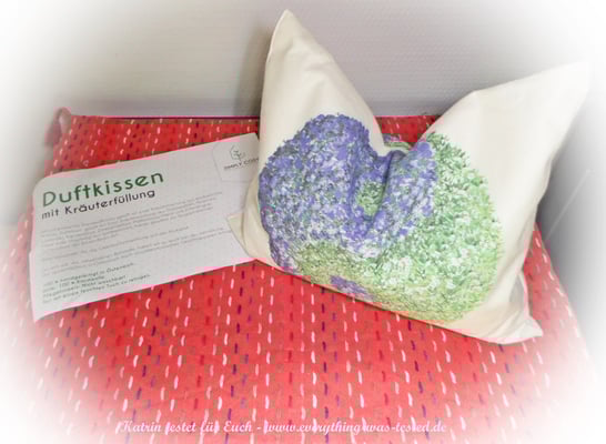 Leider roch das Lavendelkissen beim Auspacken doch nicht ganz so intensiv, wie ich es erwartet habe. Es duftete schon, aber es verströmte nicht soviel Aroma, wie das Kräuterkissen.