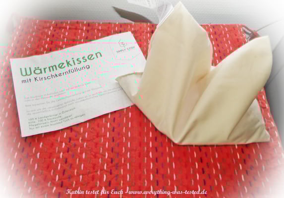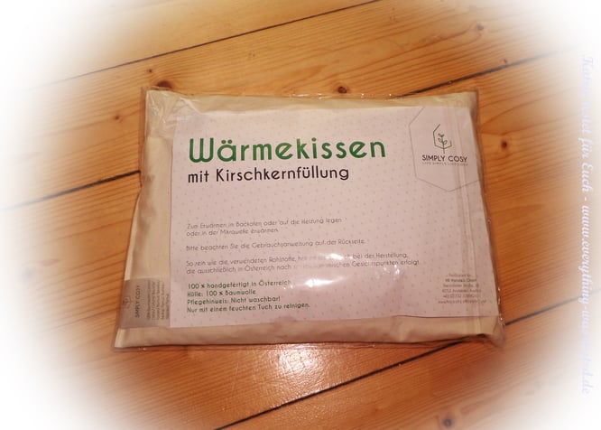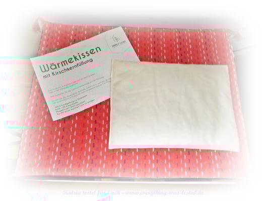 Das Kirschkernkissen riecht beim Auspacken unauffällig und enthält 350 g gewaschene Kirschkerne. Beim Kirschkernkissen habe ich kein Motiv gewählt (obwohl es eine schöne Auswahl gab), weil ich so ein Kissen nicht mit einem Design, sondern Wärme verbinde und deshalb war es mir hier nicht allzu wichtig.
