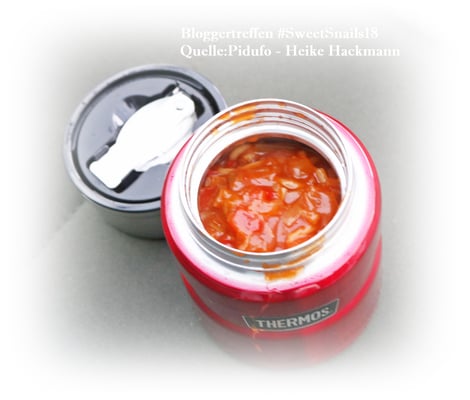 Für eine Person hat das kleine Speisegefäß (470 ml) genau die richtige Größe und passt in so manchen Rucksack oder ähnliche Taschn/ Beutel. Sein Gewicht ist nicht zu schwer und durch den am Deckel befestigten Edelstahl-Löffel kann man super problemlos damit unterwegs seine Suppe oder anderes auslöffeln. Das Speisegefäß wurde auch beim Bloggertreffen #SweetSnails18 (Bild 3) ausgiebig getestet und kam sehr gut bei allen an (Bild 3 von Heike Hackmann), daher gebe ich sehr gern 5 von 5 Sterne !