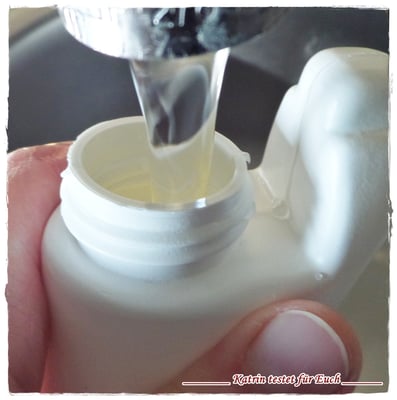 Ich habe 4 TL Kalklöser und 3 ml Allesreiniger in die Pumpflasche gegeben und anschließen mit Wasser aufgefüllt, gut durchschütteln und fertig ist das Kalklösergemisch.