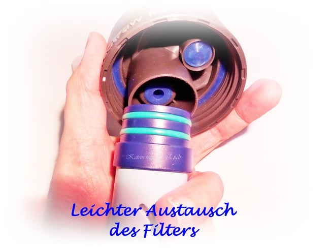 Anschließend wird der Deckel mit dem befestigtem Filter auf die Trinkflasche geschraubt und nach kurzer Zeit ist die Wasserfilterflasche schon im Einsatz. Trinkstutzen/Mundstück öffnen und trinken. Die Trinkflasche ist dicht !