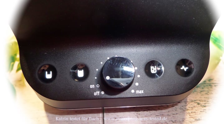 Das Bedienfeld (Bild 1-2) ist mit einem manuellem Drehknopf und vier Tasten mit Touch-Funktion (Bild 2) ausgestattet - Taste 1 (linke Seite) - halbvoller Behälter bis 750 ml Inhalt, Taste 2 (linke Seite) - voller Behälter bis 1500 ml Inhalt, Taste 3 (rechte Seite) - Eis Crash und Taste 4 (rechte Seite) Intervallmixen. Die einzelnen Touch- Funktion Tasten (Bild 2) leuchten erst nachdem man den Mixer über den manuellen Drehknopf in der Mitte auf On einschaltet. Auf der Rückseite (Bild 3) befindet sich ein On/Off (0/1) Schalter und dient als Kindersicherung.