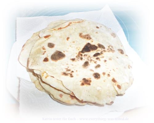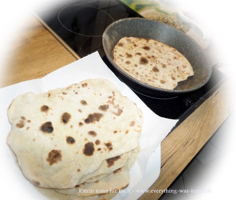 Den Teig anschließend in pfannengroße dünne Fladen ausrollen und in der Pfanne mit etwas Öl oder auch keins (wie ihr wollt) beidseitig ausbacken. Das erste hatte ich mit Öl probiert, da wird es nicht so trocken, als wenn man es ohne Öl ausbäckt.