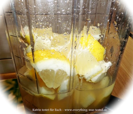 - Die Zitronen gut waschen und in kleine Stücke schneiden und ab in den Mixer.