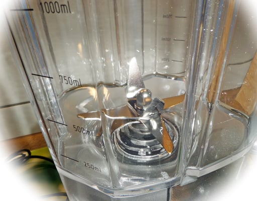 Um den Blender schnell zu reinigen, gebt Ihr nach der Verwendung einfach noch etwas Wasser mit einen Tropfen Spülmittel in den Mixbehälter und schaltet ihn nur kurz auf Power. So werden die meisten Ansätze vom Behälter im Inneren gelöst und gereinigt. Dann nur noch einmal mit einem Schwamm oder Bürste (aber keine, die alles zerkratzen) und klarem Wasser auswaschen - Vorsicht bei den scharfen Messern !