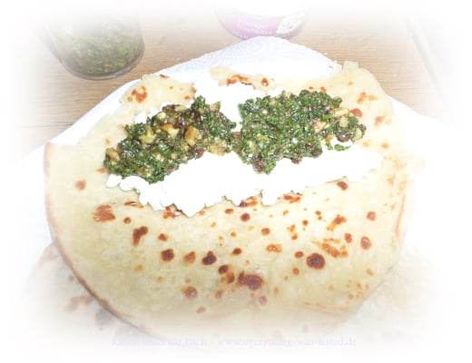 Gefüllt habe ich mein erstes selbstgemachtes Pfannenbrot mit körnigem Frischkäse (laktosefrei) und selbstgemachtem Petersilien Pesto - das war so lecker 🤩 Natürlich könnt Ihr es auch mit etwas Süßem oder beim Grillen, mit Eurem Grillgut befüllen !