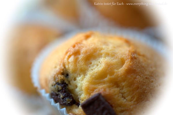 - Den Teig in die vorgefetteten Muffin-Förmchen und mit Blaubeeren oder Choco Chips verzieren.